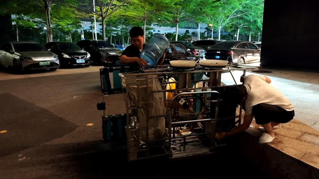 这台机器人功勋卓著。比赛结束后,小伙伴们冲淡水对其进行保养